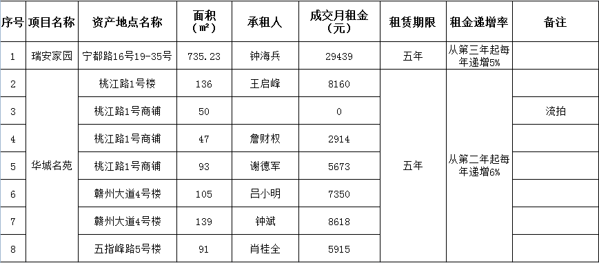 2020年10月22日上午10時(shí),在贛州市公共資源交易中心舉行的贛州振興實(shí)業(yè)有限責(zé)任公司8宗商鋪資產(chǎn)公開招租(項(xiàng)目編號(hào):GZCQ2020068),現(xiàn)將公開招租成交情況公示如下:
